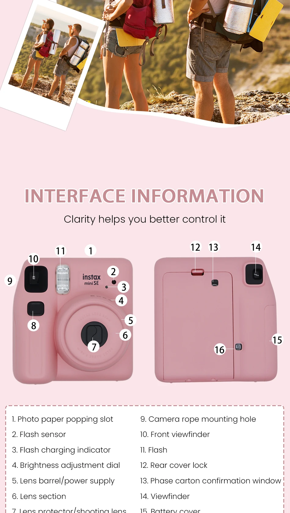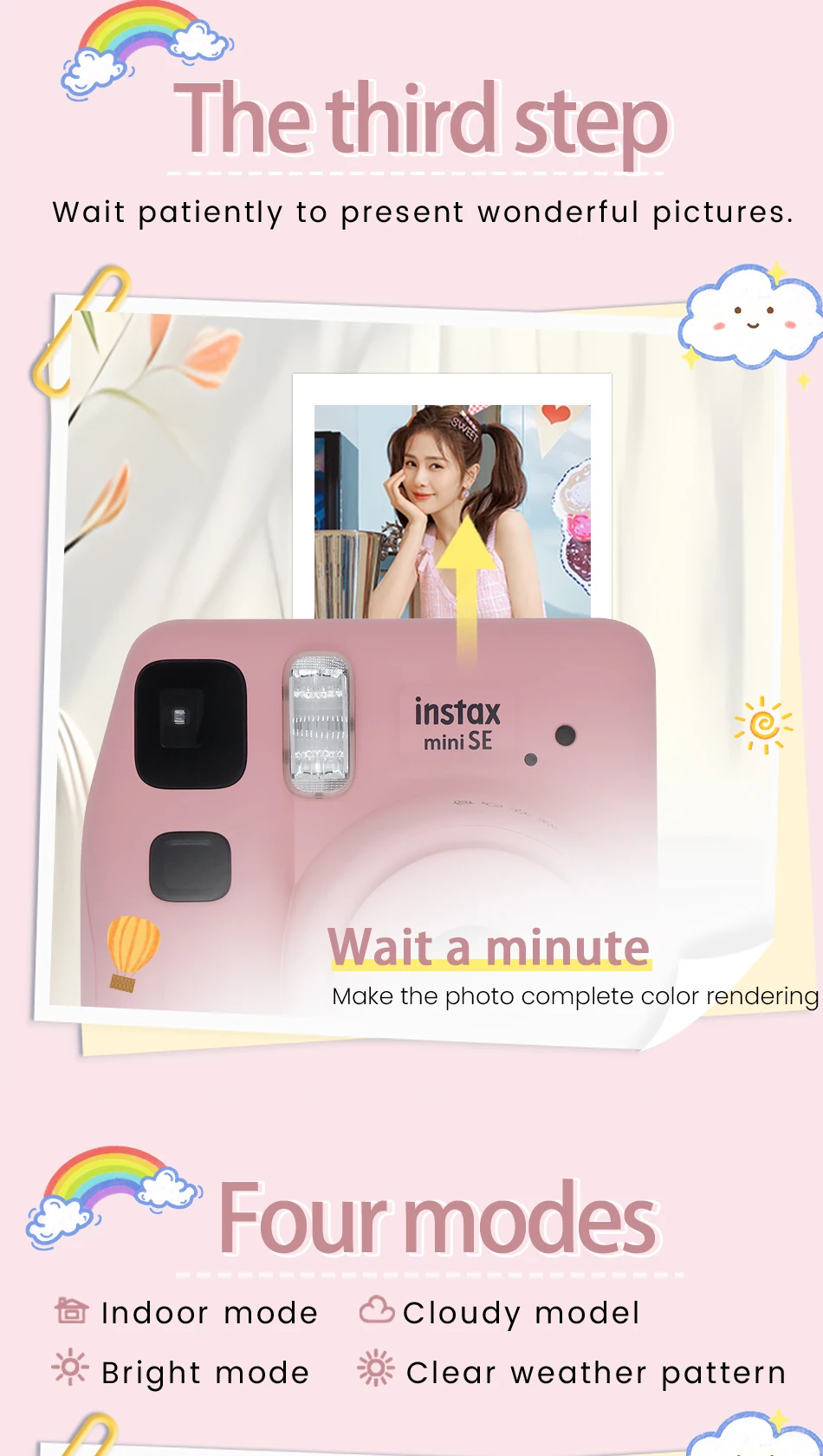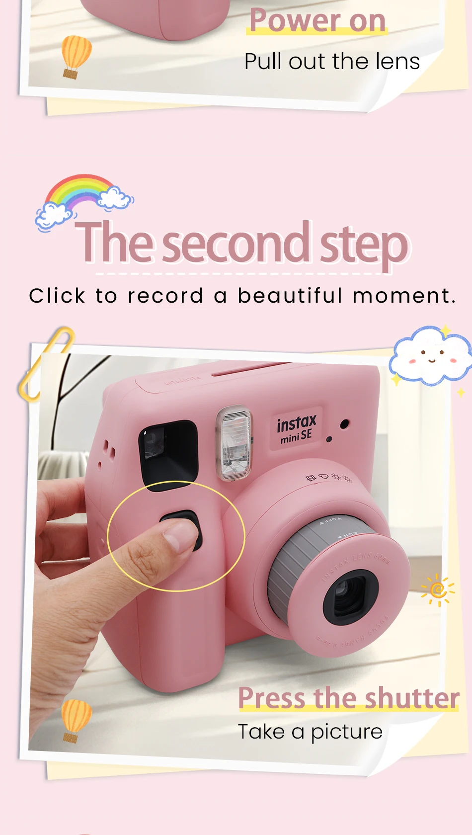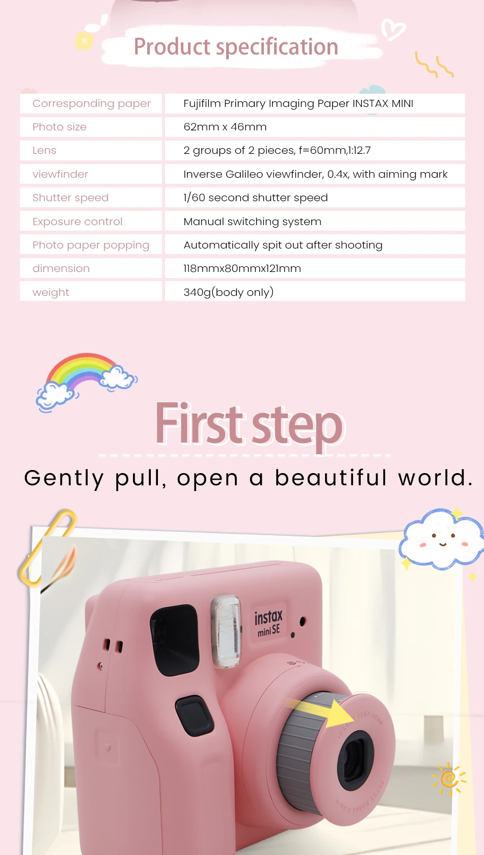 | Color | 10 Exposures Film, Mini SE White, Mini SE Pink, Mini SE Blue, SE White with shell, SE Blue with shell, SE Pink with shell |